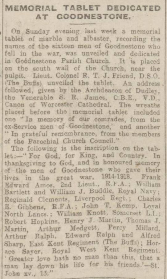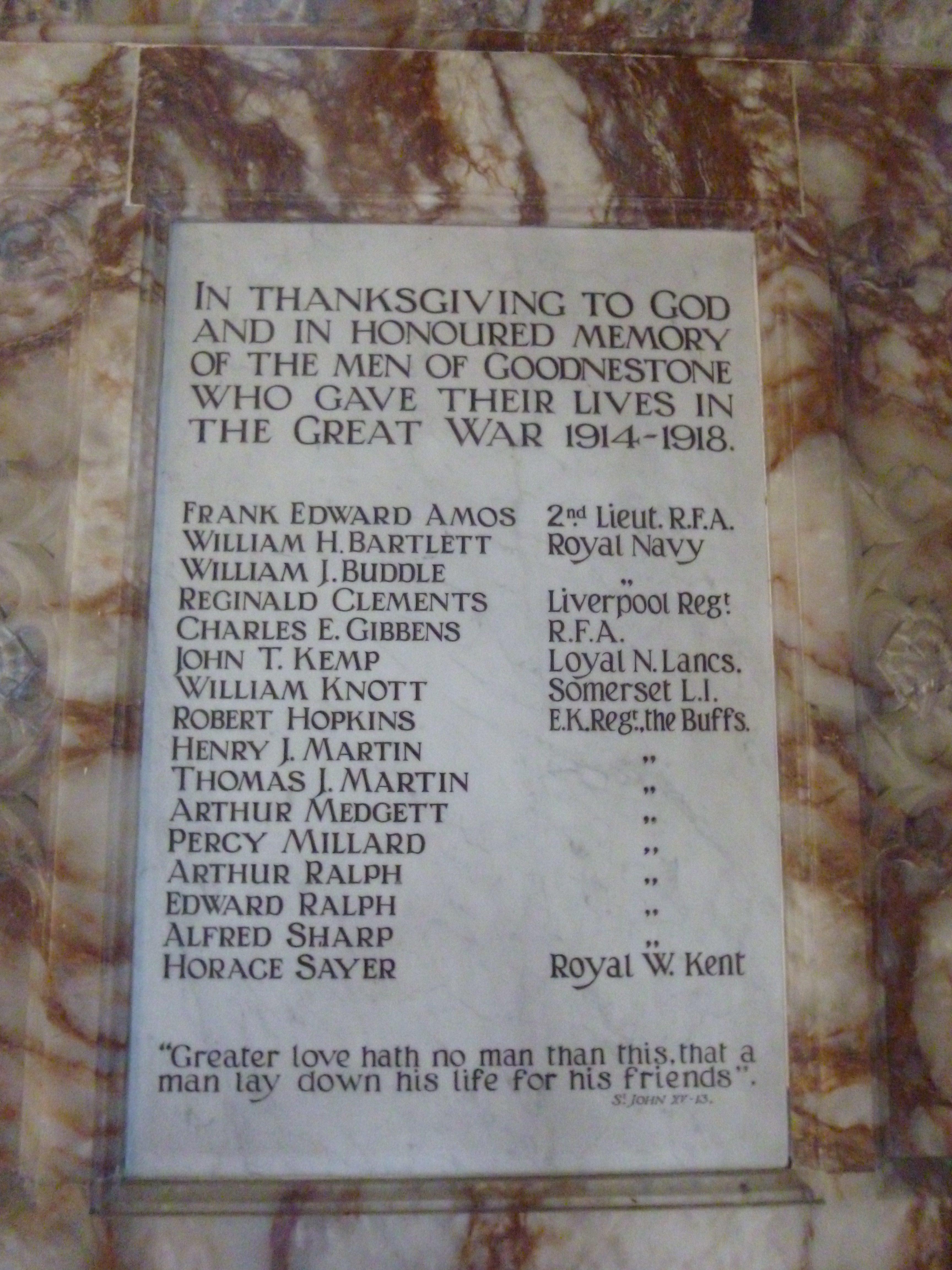 In thanksgiving to God and in honoured memory of the men of Goodnestone who gave their lives in the Great War 1914-1918. “Greater love hath no man than this, that a man lay down his life for his friends”.